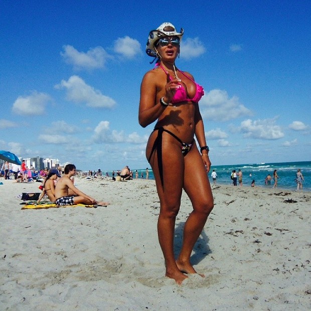 Usando um chapéu de cowboy e biquíni de babados, loira exibiu suas curvas em praia nos Estados Unidos.